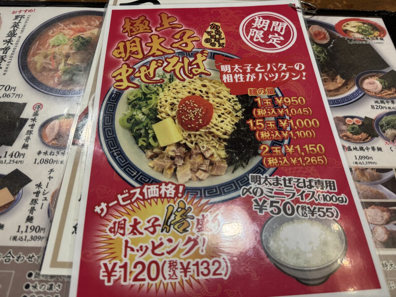 麺屋くさびでは「極上明太子まぜそば」が期間限定で販売中です。郡山市には本店・イオンタウン郡山店・富田店の3店舗があります。富田店でも期間限定メニューが販売されていました。
